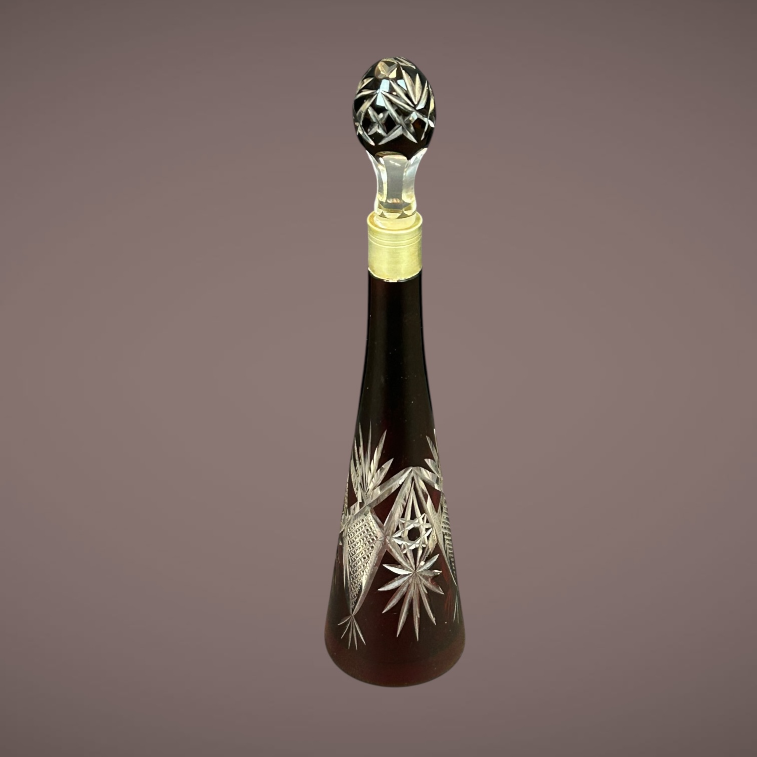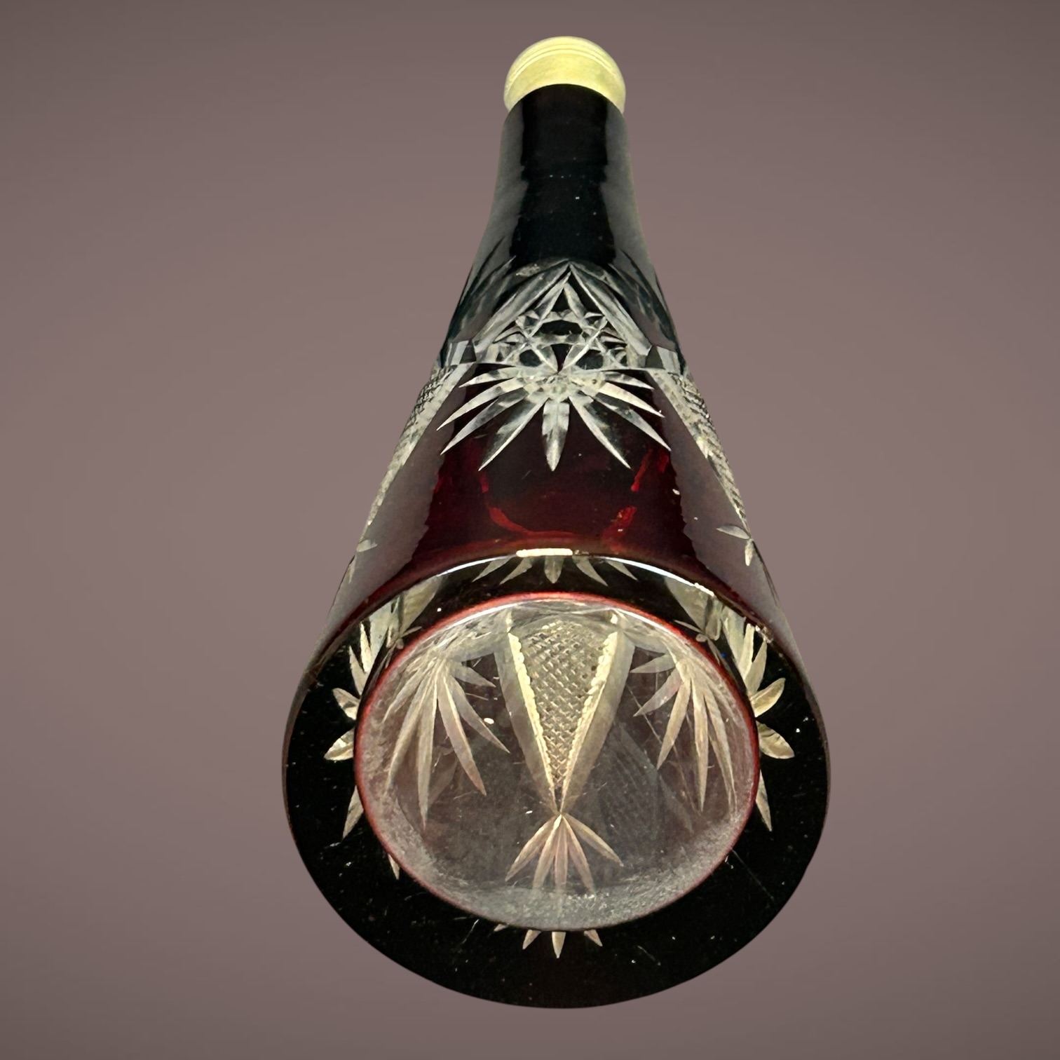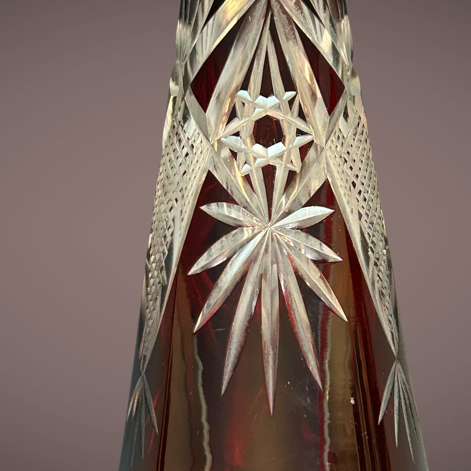 Carafe élégante en cristal taillé rouge rubis avec bouchon assorti. Cristal doublé laissant apparaître des motifs étoilés et géométriques. Pièce décorative typique du cristal européen du XXe siècle.