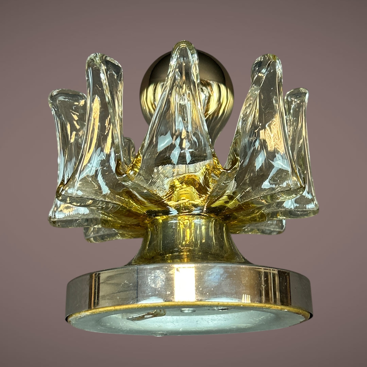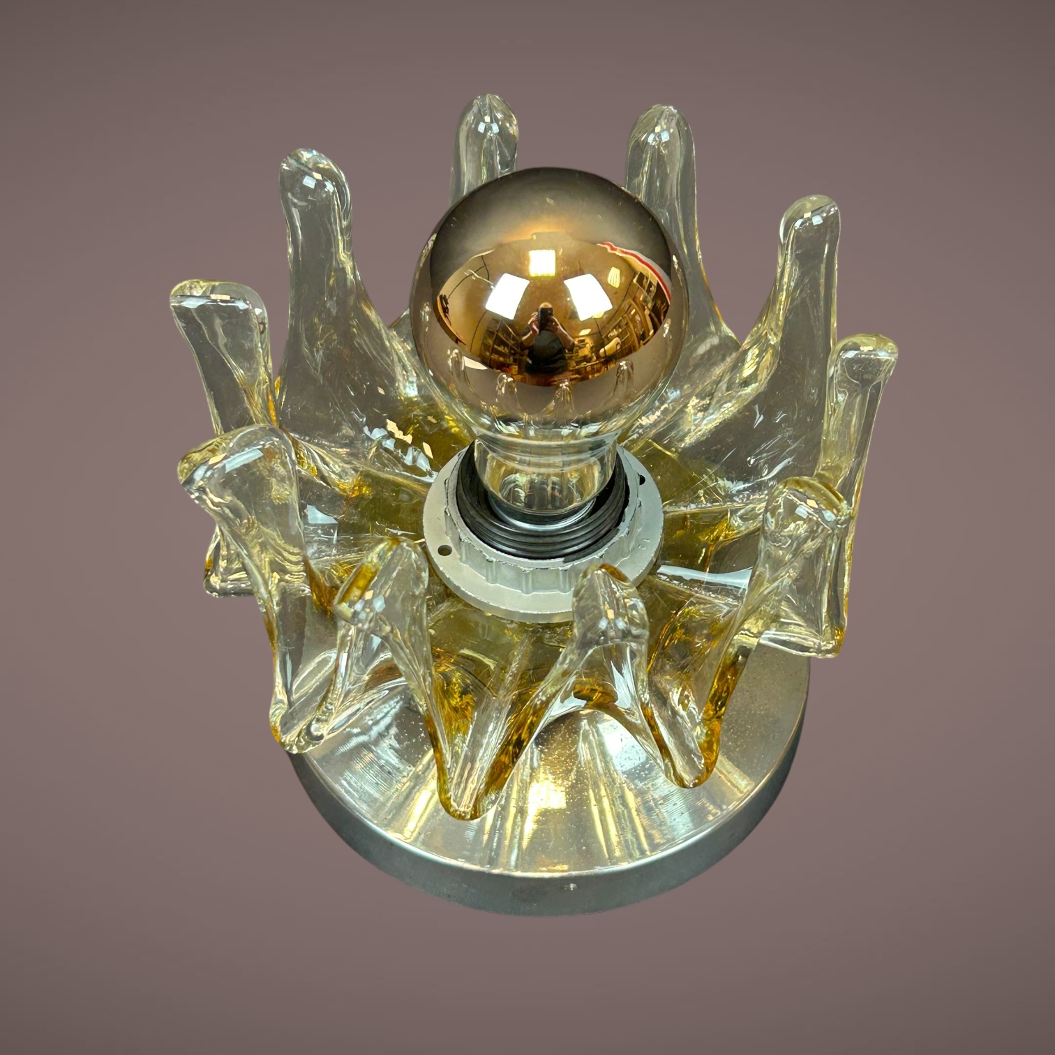 Design italien typique des années 1960 avec éléments en verre formant une couronne autour de l’ampoule centrale.