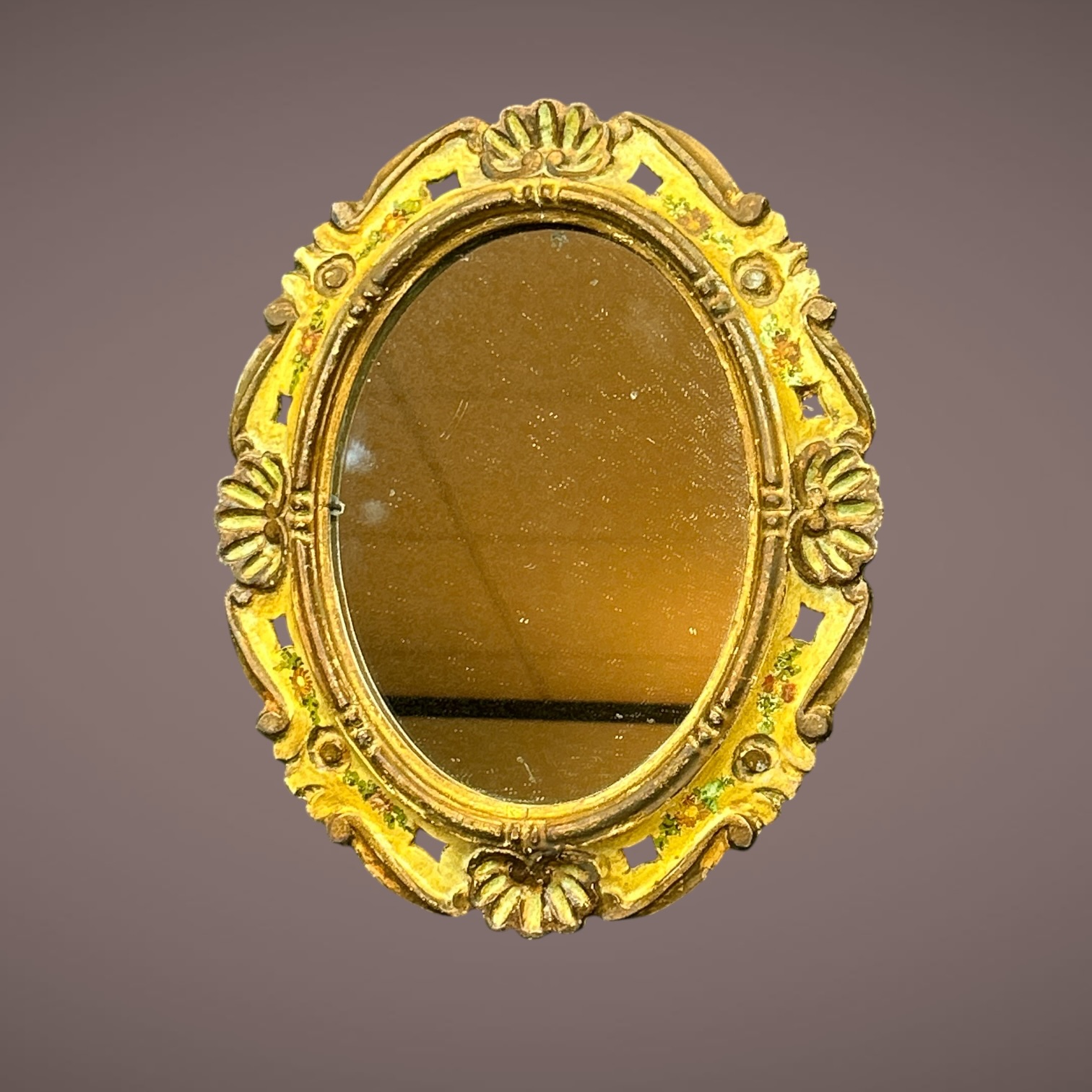 Charmant miroir ancien ovale en bois sculpté et polychrome avec décor rocaille et motifs coquilles. Belle patine. Circa 1920-1940.