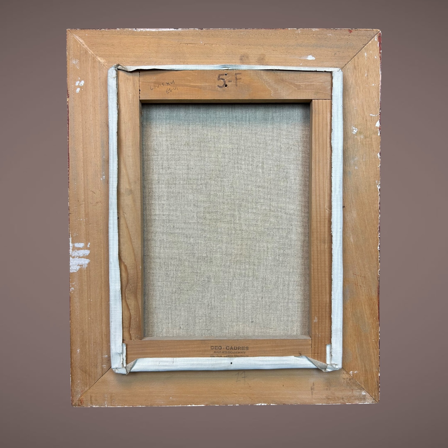 Peinture à l’huile au couteau, sur toile, représentant un bouquet de fleurs multicolores. Cadre en bois.