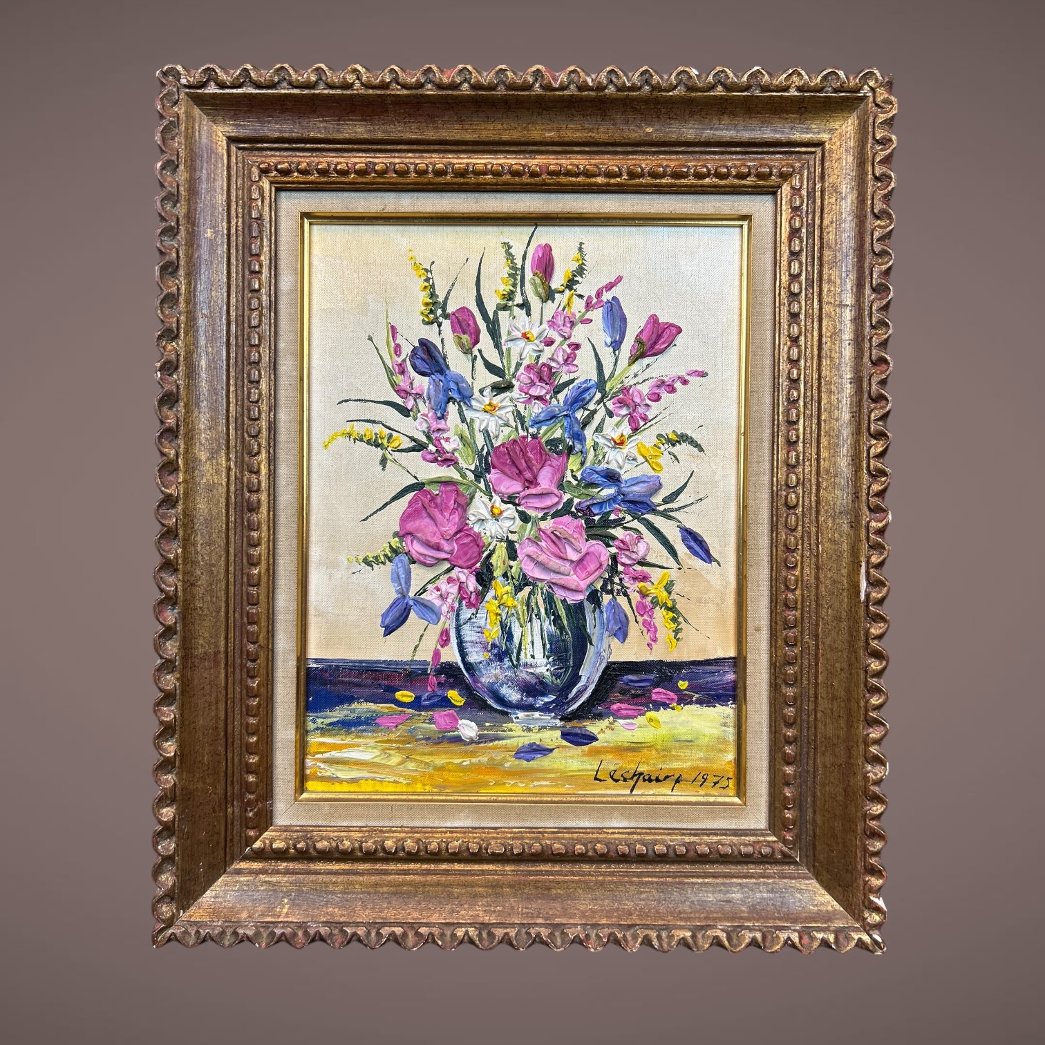 Peinture au couteau bouquet de fleurs Adrien Lechaire 1975